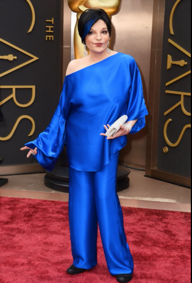 Where do I even start with this hot mess. Liza Menelli followed in Penelope Cruz's footsteps apparently, going for the 'bedroom couture' look. However, she just decided to just wear her silk pajamas to the Oscars. Like really Liza? Really? With the amount of money this woman has, she could have hired someone to make her look amazing. But instead, she looked messy, and it was completely inappropriate for her age. The blue stripe in her had and those earrings, paired with her orthopedic shoes were just so wrong, it pained me to look at her.